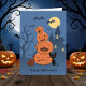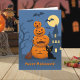 Cute black cat and a witch broom near a stack of laughing pumpkins that are falling over. A dead tree, a creepy mansion, some bats, and the moon are seen on the background.