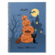 Cute black cat and a witch broom near a stack of laughing pumpkins that are falling over. A dead tree, a creepy mansion, some bats, and the moon are seen on the background.