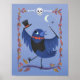 A Prussian blue feathered black bird is dressed formally in a satin vest, orange bow-tie, top hat and cane as he dances upon a tree branch under the white crescent moon. A charming happy skull and bones top the fall leaf boarder against a periwinkle night sky and a little spider hanging from a web joins in the festivities. Mr. Ravenscroft is formally dressed as he dances in the moonlight on a magical Halloween night! Original illustration by Noël Snow.