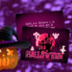Happy Halloween card with scary castle and ghost on purple pink moon background. Cute halloween gift for everyone. The text of wishes can easily be personalised