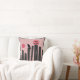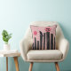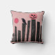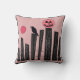 Halloween scene with fence, crow, full moon, & pumpkin on a fun pink background throw pillow.