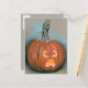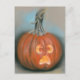 This Halloween postcard features artwork in soft pastel shades depicting a carved pumpkin with a spooky yet cute cross-eyed Jack o’ lantern face.