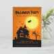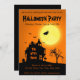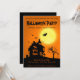 Happy Halloween illustration featuring a spooky black landscape with a scary house, a creepy tree, bats and a witch flying on her broom; all on an orange background with the full shiny moon.