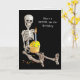 sitting skeleton holding a cupcake with lit candle and colourful sprinkles for Halloween birthday