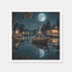 A skeleton wearing a red baseball cap sits in a small boat on a tranquil moonlit canal, with cosy cabins lining the shore