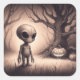 This hauntingly whimsical sticker set features a beautifully rendered pencil drawing of a small space alien standing in a mysterious, dreamlike landscape, where spooky trees twist their limbs in the background like watchful sentinels. At the base of one particularly gnarled tree rests a glowing jack-o’-lantern, casting an eerie but cosy glow that anchors this surreal tableau firmly in the spirit of Halloween. The overall vibe is equal parts retro science fiction, quiet horror, and delicate melancholy, bringing together the otherworldly charm of extraterrestrial life with the cosy eeriness of spooky season. It’s a sticker that speaks to lovers of the strange, the subtle, and the seasonally surreal.
