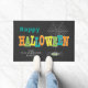 This Halloween door mat offers a fun design featuring the text "Happy Halloween" appearing is bright orange, green, yellow and teal. The design is accented with a spider and web. Personalise with your name.
