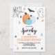 Halloween birthday party invitation. Let's get spooky! birthday bash invite with turquoise pumpkins and stars and spiders.