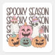Halloween Spooky Season design is a colourful, fun, retro style design featuring ghosts in sunglasses and witch hats and pumpkin jack-o-lanterns of orange, teal, and pink with text that reads Spooky Season!