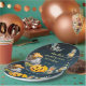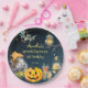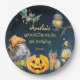 Halloween spooky spooktacular birthday party tableware personalised template plates, Halloween pumpkin, bat, owl, cat, brewing pot starry night sky black background.