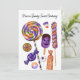 A delicious Halloween Birthday card design featuring illustrations of various Halloween candies including eyeball gumballs, gummies, striped lollipop, and swirly striped hard candy in orange, purple and black colours.