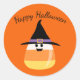 Small round shape sticker shown with a graphic print of a cute Halloween candy corn.