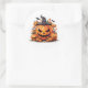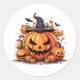 Round sticker is shown with a festive Halloween pumpkins art print.