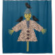 This awesome shower curtain features a digital art image of a straw scarecrow with ravens sitting on its head and arms. The scarecrow is mounted on a wooden stake and is wearing an old blue shirt and brown jacket with buttons. It has a grey hat on its head and straw poking out from the arms of the jacket. The eyes are crosses and the mouth is twisted in an evil frown.