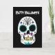 A greeting card featuring a hand drawn sugar skull design on black with the words Happy Halloween on the front. The inside reads “May all your spooky wishes come true.”