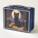 Halloween themed tarot card with a black cat metal lunch box