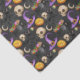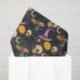 A pattern of various Halloween themed things like witch hats, black cats,skulls