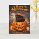 Illustration features an adorable black kitten popping out of a glowing jackal lantern waving a tiny paw under a full moon set in a magical autumn scene with friendly little ghosts flickering candles and bats fluttering by. It's the perfect way to wish friends and family a fantastic holiday with its warm storybook glow and vibrant colours. This card is a keepsake worthy treasure that captures all the charm and wonder of Halloween night