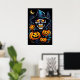 Ignite the Halloween spirit with this captivating poster! A bone-chilling skeleton, its eyes aglow with an otherworldly fire, readies itself for the haunting festivities. Carved pumpkins stand sentinel, casting an eerie glow that dances with the spectral presence. This poster captures the essence of Halloween's thrilling anticipation.