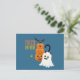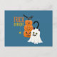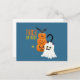 This postcard features a geometric design of a mischievous and playful black and white cat hiding under a sheet playing ghost, adding a touch of fun to the Halloween theme. The words "Trick or Treat" are incorporated, making it a perfect choice for sending Halloween greetings or invites.