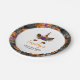 This sweet baby shower paper plate features a cute unicorn face with orange and black faux glitter horn and eyelids, adorned with an autumn bouquet of orange, black, and purple flowers and leaves. The name of the mum-to-be appears in orange calligraphy below, followed by customisable text identifying the occasion and the date in black sans serif font. The outer edge of the plate is decorated with a floral pattern based on the bouquet. The ideal design for a Halloween-themed or unicorn-themed October girl's baby shower. See our collections for matching unicorn invitations, party supplies, gift ideas, and nursery or girl's bedroom decor.
