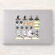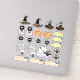 Fun Happy Halloween custom cut vinyl stickers featuring a witch's hat, black cat, skull and cross bones, spider web with creepy spider, vampire bat and funny face pumpkin.