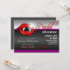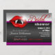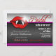 Halloween themed bridal shower invitations in red, purple, and dark grey, with luscious lady vampire lips & teeth. Text reads: "Join us, into the night, as {name} seeks to claim her "latest victim" (crossed out to read: "future husband").