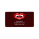 Destei's cartoon illustration of a vampire mouth. The lips of the mouth are red and the teeth including fangs are white. The background colour is burgundy red / dark red. There is also a personalizable text area for a name and address, for example.