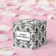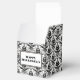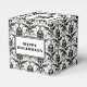 Personalised black and white square favour box with an elegant and romantic Halloween themed Gothic floral damask pattern and black skull design. To personalise the text message on the front and back side type your own text in the template fields. Matching Halloween party decor available at the ScriptoGraphic Design Store.