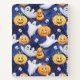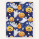 This design features a whimsical and festive Halloween-themed watercolor pattern. The design includes a dark, starry night sky as the background, which sets the stage for a collection of friendly ghosts and cheerful jack-o'-lanterns. The ghosts are painted in soft whites with various cute expressions, floating playfully around the scene. The pumpkins are bright orange, with carved faces ranging from happy to mischievous. Small white skulls are scattered throughout, adding to the Halloween ambiance. The overall pattern is fun and lighthearted, perfect for celebrating the spooky season in a cute and charming way.