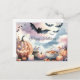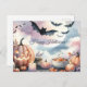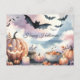 A whimsical watercolor Halloween scene featuring a large, glowing full moon surrounded by soft clouds. A carved pumpkin with a cheerful face sits next to smaller pumpkins. Several bats flutter across the sky, enhancing the spooky atmosphere. The overall mood is festive and enchanting, capturing the spirit of Halloween. Designed by artist Danguole Serstinskaja. #generativecontent