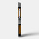 This phone case has a mid-century modern design that looks like a weave with orange and white lines on a field of black.