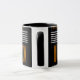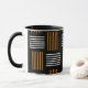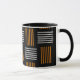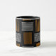This mug has a mid-century modern design that looks like a weave with orange and white lines on a field of black.