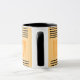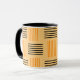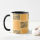 This mug has a mid-century modern design that looks like a weave with orange and black lines on a field of pale orange.