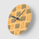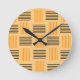This clock has a mid-century modern design that looks like a weave with orange and black lines on a field of pale orange.
