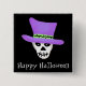 Great "happy Halloween" badge pin to wear on Halloween to a party or other functions. This badge features a whimsy skeleton skull with a purple top hat. You can customise the words "happy Halloween" to other words below the skull. Great for Halloween festivies, parties and general use This skull came from hand painted original art featuring three dancing skeletons with a purple top hat on their skulls and is in the colours black, white and purple. Check for my other products with this art for goulish products for Halloween including greeting cards, tee shirts, posters, wall decals, electronic device cases and more. Fully customisable for personalisation. The original art is by Phyllis Dobbs who wishes you a happy and ghoulish Halloween.