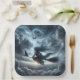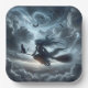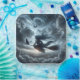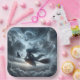A witch rides a broomstick through a stormy night sky accompanied by a black cat and surrounded by swirling clouds and lightning