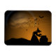 Halloween witch and cauldron amidst a spooky background with orange night sky, moon lit.  Bats flying around.  www.giftideas505.com