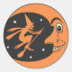Classic round stickers with vintage orange and black Halloween witch and moon.