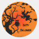 Halloween Witch And Owl Halloween Stickers. A witch on a broomstick, an owl on a spooky tree and bats on orange background.