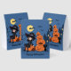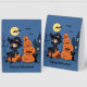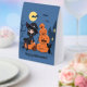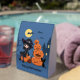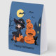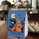 Cute little witch dressed in black sitting on a pumpkin. Her broom leans on a stack of laughing pumpkins watched over by a black cat. A dead tree, a creepy mansion, some bats, and the moon are seen on the background.
