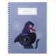 This is a drawing of a black cat wearing a dark purple witch hat. There is a bat with glowing red eyes dangling at the tip of the hat. There are also spider webs in the background.