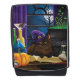 A magical brown chocolate coloured cat wearing a purple witch hart sitting on books. Cauldron, pumpkins, potions, and wand sit amongst the cat.