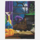 A magical brown chocolate coloured cat wearing a purple witch hart sitting on books. Cauldron, pumpkins, potions, and wand sit amongst the cat.