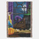 A magical brown chocolate coloured cat wearing a purple witch hart sitting on books. Cauldron, pumpkins, potions, and wand sit amongst the cat.