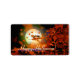 Labels with my original design of the silhouette of a witch and broom flying past a full moon with fall leaves. Customisable text says "Happy Halloween!"