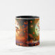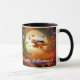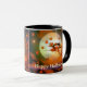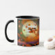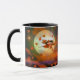 Coffee mug with my design of a witch on a broom flying past a spooky full moon on Halloween night, stirring up the autumn leaves. Customisable text says "Happy Halloween".