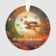 Hanging ornament with my original artwork of the silhouette of a witch flying past a spooky full moon on Halloween night, stirring up the autumn leaves. Customisable text says "Happy Halloween".