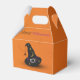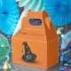 Happy Halloween illustration featuring a witch hat with golden stars and moon and a hanging spider on an orange background with jack-o-lantern pattern shapes.