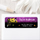 This fun and spooky address label features a cute witch beside a crooked haunted house. In the background is a full moon with bats and a purple night sky with stars. The text combines decorative and serif fonts for a stylish and modern look. This is perfect for Halloween.